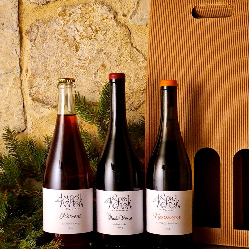 Karácsonyi hármas borcsomag, ajándék dobozzal. Patent 2024, Narancsos 2024 és Budai Vörös 2023.